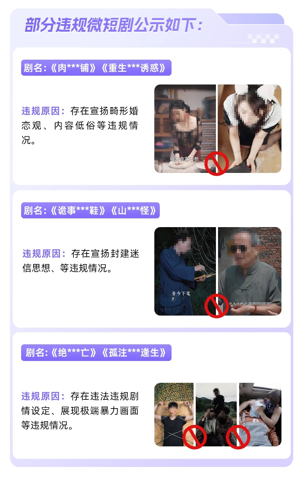8月平台下架存在涉封建迷信、色情低俗、极端复仇、违法违规等价值观导向不良问题的微短剧79部,部分违规微短剧公示如下: