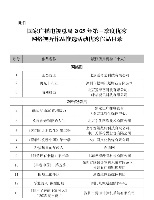 国家广播电视总局公布2025年第三季度优秀网络视听作品推选活动评审结果